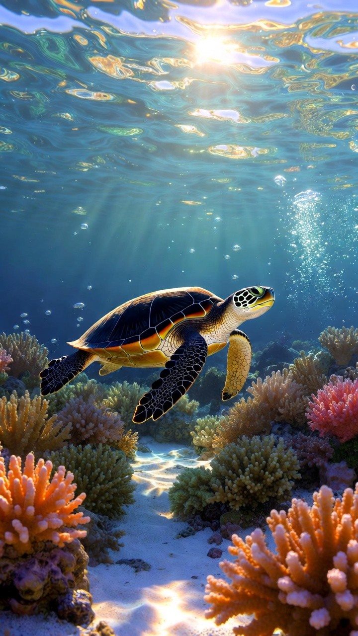 Dive into a peaceful tropical escape! This breathtaking live wallpaper features a majestic sea turtle swimming gracefully through a vibrant, sunlit coral reef. With crystal-clear waters, radiant sunbeams dancing from the surface, and gentle bubbles rising, this serene aquatic animation brings a deeply relaxing and beautifully vivid slice of nature directly to your screen.