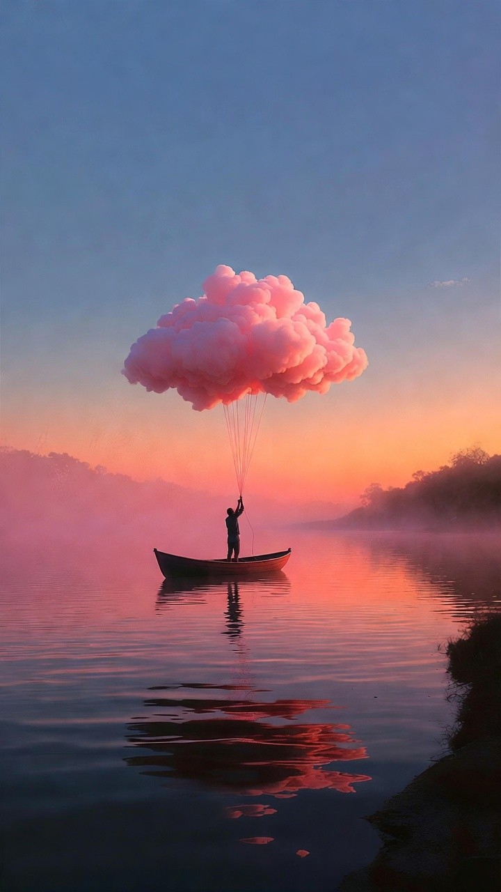 A surreal vertical scene depicts a dark silhouette of a person standing in a small wooden boat on a tranquil lake. The person holds multiple thin strings attached to a large, fluffy pink cloud floating directly above them, resembling a giant balloon. The background features a soft sunset with vibrant orange and purple hues reflecting on the water's surface. A gentle mist clings to the distant shoreline, adding to the dreamy, peaceful, and whimsical atmosphere of the composition.