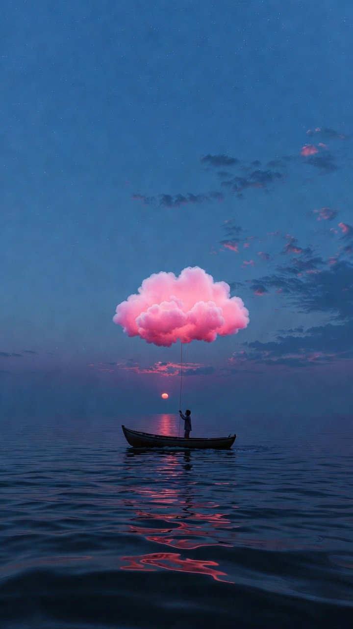 A vertical surreal composition features a dark silhouette of a person standing in a small boat on a vast, calm ocean. The person holds a single string attached to a vibrant, fluffy pink cloud that floats directly above them. A small, bright orange sun sits low on the horizon, casting a shimmering pink and orange reflection across the rippling dark water. The sky is a deep purple and blue, dotted with soft clouds and faint stars. The scene is dreamy, peaceful, and whimsical.