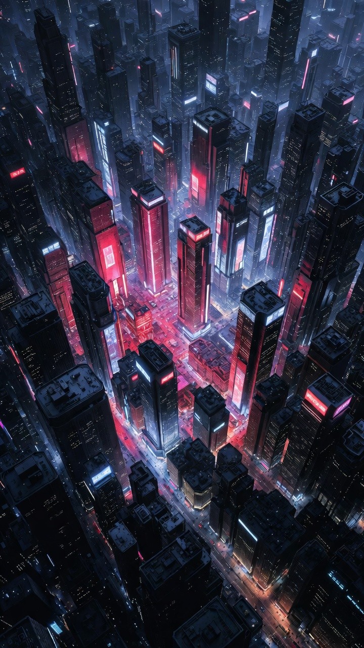 A stunning high-angle vertical shot of a futuristic city at night. Dense, dark skyscrapers with glowing blue and white windows stretch across the frame. The heart of the city is illuminated by a network of vibrant red streets and neon billboards, casting a warm, hellish glow upward onto the metallic surfaces of the surrounding buildings. The sharp perspective and high-contrast lighting create a moody, high-density urban environment typical of a cyberpunk dystopia.
