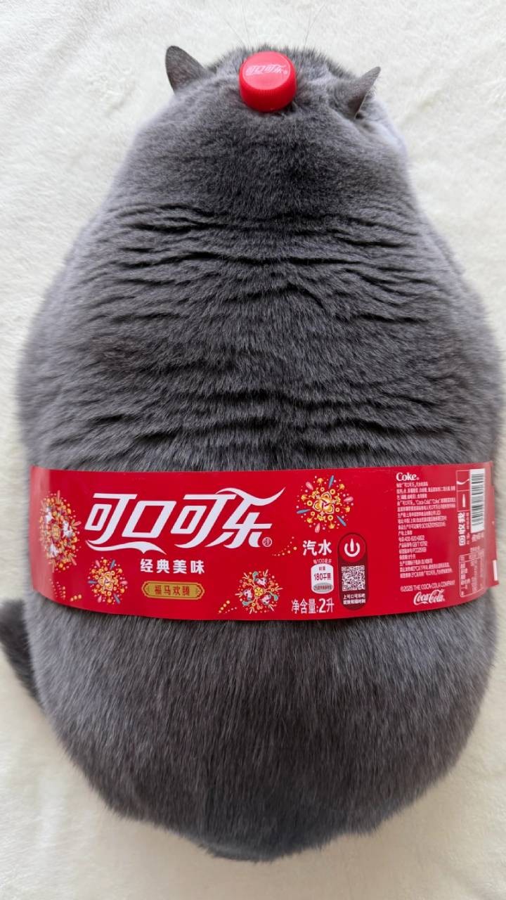 A humorous vertical photograph featuring a large, fluffy grey British Shorthair cat from behind. The cat is cleverly disguised as a 2-liter bottle of Coca-Cola; a red plastic bottle cap is placed on its head between its ears, and a large red Coca-Cola label is wrapped around its thick middle. The cat's dense, plush fur mimics the shape of a bottle, creating a funny and endearing visual pun. The scene is set against a simple, soft white carpet, making the vibrant red of the "Coke" branding pop.