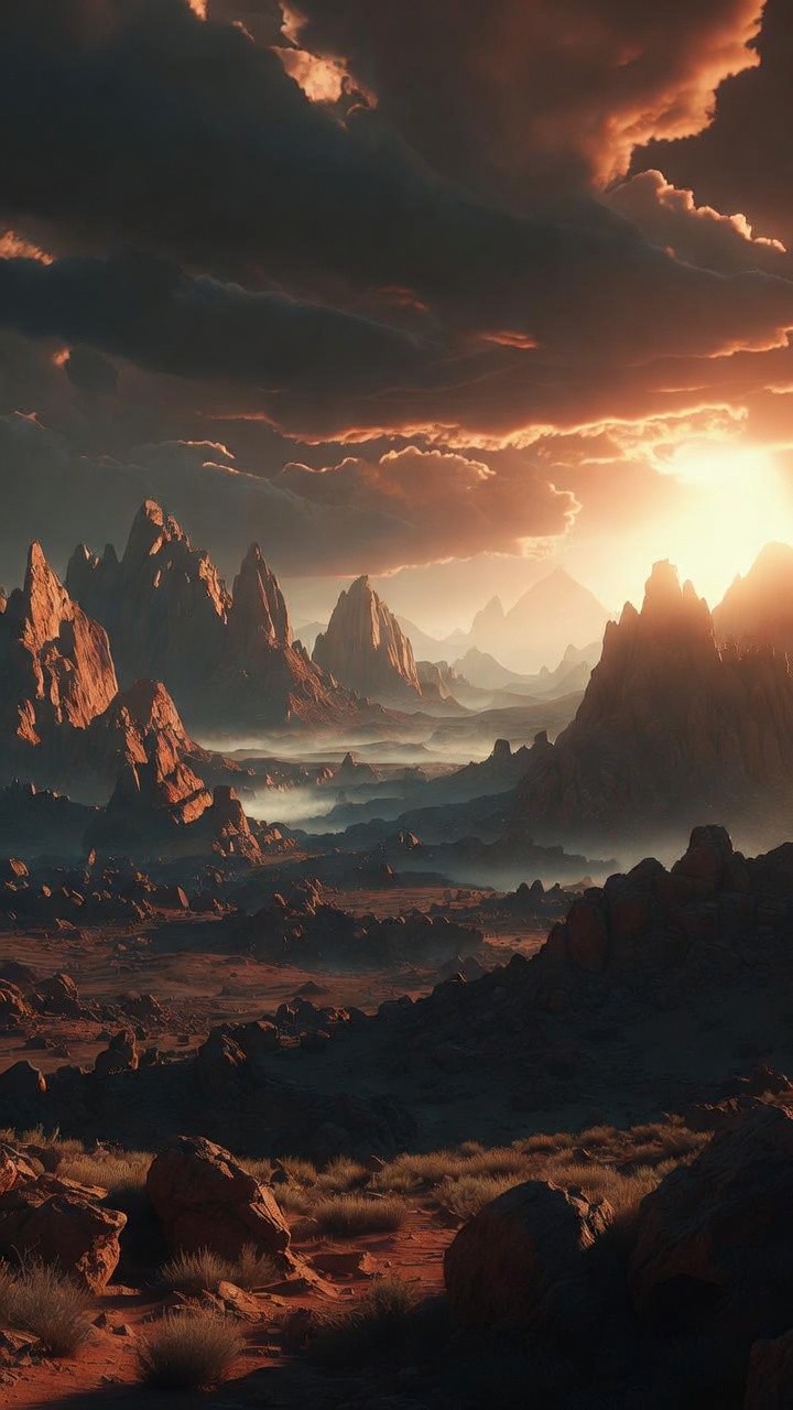A stunning vertical landscape captures a vast valley of sharp, needle-like mountain peaks at dawn. The rising sun breaks through a heavy layer of dark, swirling clouds, casting a warm golden glow across the rugged terrain. A light mist settles in the lower elevations of the valley, while the foreground features textured red rocks and sparse desert grasses. The high-contrast lighting creates deep shadows and brilliant highlights, emphasizing the epic scale and raw beauty of the wilderness.