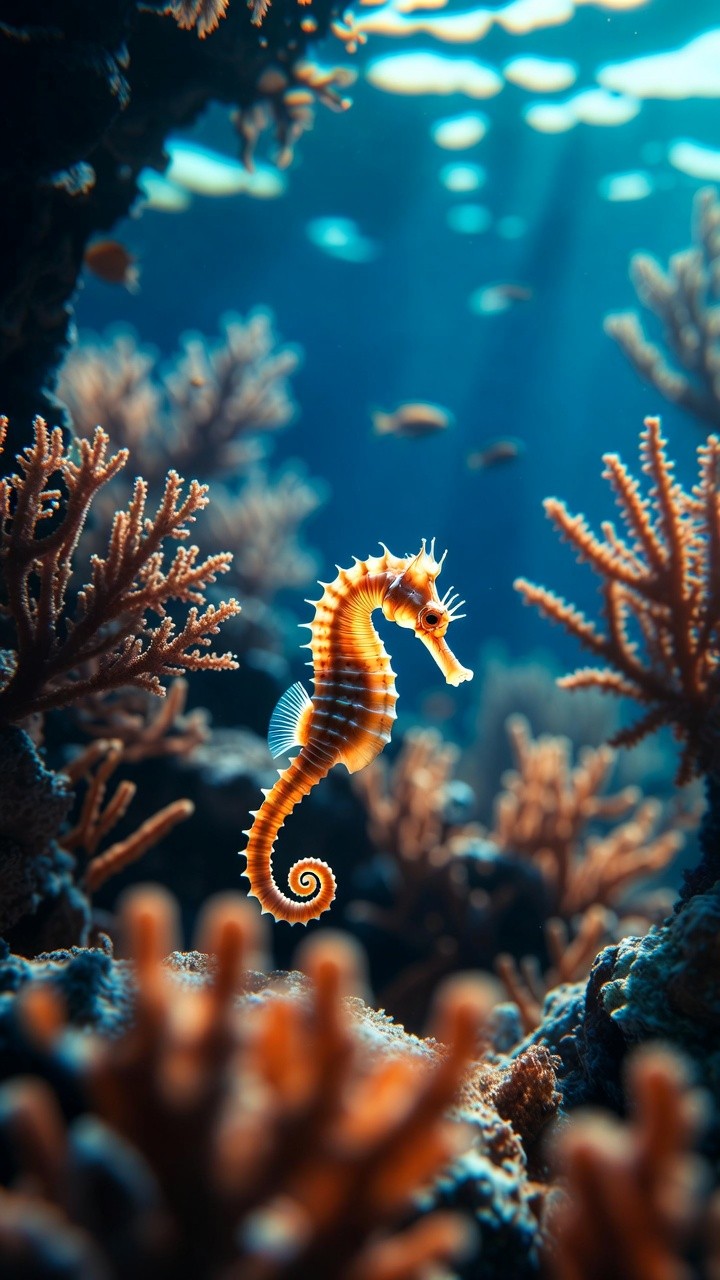 Bring a touch of pure aquatic elegance to your screen! This breathtaking live wallpaper features a beautifully detailed golden seahorse floating gracefully among intricate, sunlit coral branches. Set against a backdrop of crystal-clear, deep blue ocean water, this serene and highly textured underwater scene offers a deeply calming, sophisticated escape to elevate your lock screen.